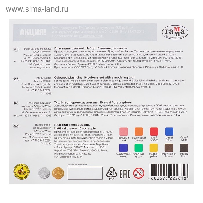 Пластилин 10 цветов 200 г, Гамма "Классический", со стеком, картонная упаковка 268016