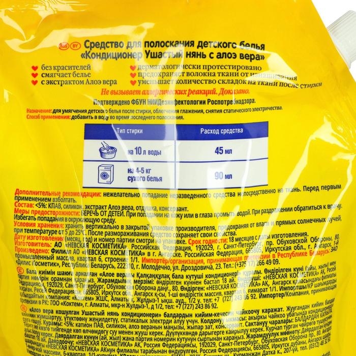 Кондиционер подходит для стирки детского белья, в том числе новорожденных. Придает детскому белью особенную мягкость, облегчает глажение, обладает антистатическим эффектом, придаёт белью приятный нежный аромат, уменьшает количество складок после стирки, предохраняет волокна ткани от изнашивания, улучшает гигроскопичность ткани (впитываемость влаги). Содержит экстракт Алоэ вера, который известен своими смягчающими, увлажняющими и успокаивающими кожу свойствами. Удобно дозируется с помощью колпачка-мерника. Благодаря двойным стенкам колпачка, после дозировки кондиционер стекает внутрь флакона, оставляя флакон чистым и сухим. Дерматологически протестирован. Не содержит красителей. Не вызывает аллергических реакций.
