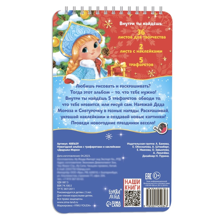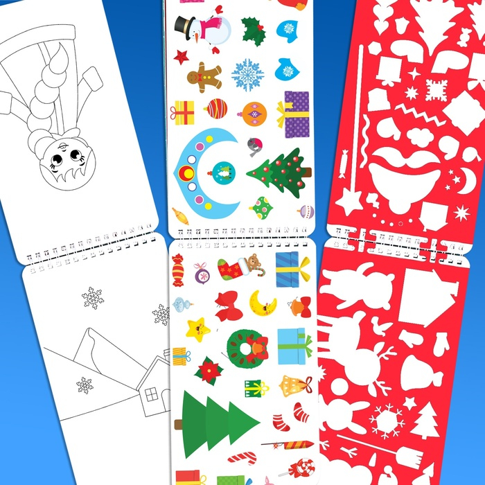 - Внутри ребёнок найдёт 5 трафаретов для новогодних рисунков, 2 листа с наклейками и 36 листов для творчества.