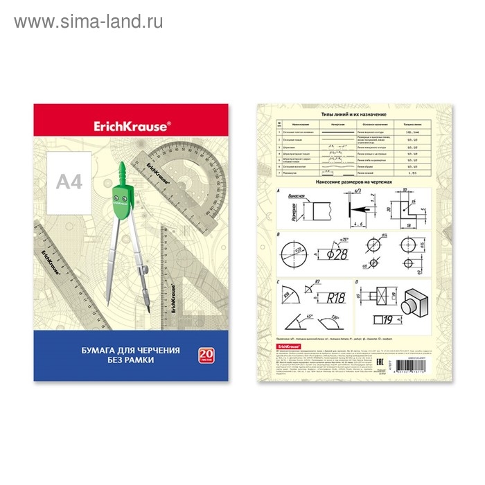 Бумага для черчения А4, 20 листов, блок 200 г/м², ErichKrause, без рамки, в картонной папке