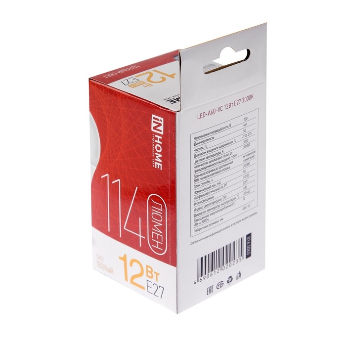 Лампа светодиодная IN HOME LED-A60-VC, Е27, 12 Вт, 230 В, 3000 К, 1140 Лм
