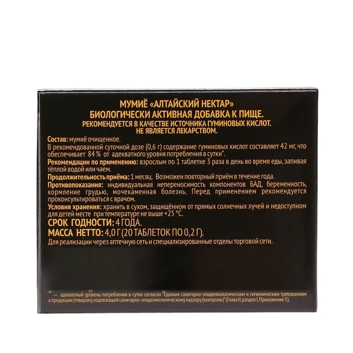Мумиё «Алтайский нектар» восполняет в организме дефицит гуминовых кислот: в рекомендованной дозе 0,6г их содержание составляет 37,2 мг или 74,4% от суточной потребности.