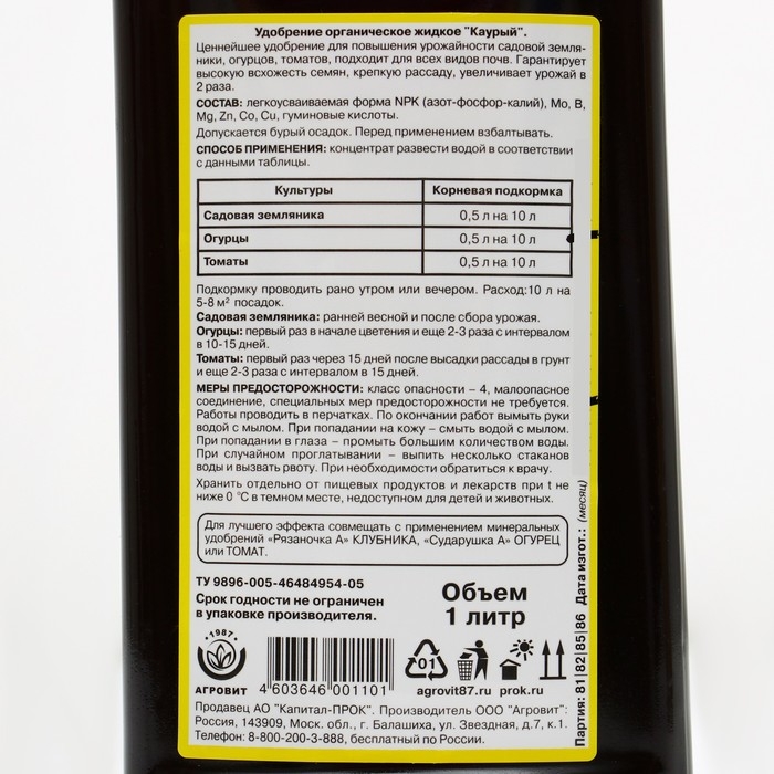 Ценнейшее органическое удобрение Каурый для восстановления плодородия всех видов почв, содержит оптимальный набор питательных веществ. Продукт получен методом экстракции навоза на специальном оборудовании по технологии, обеспечивающей его полную очистку от яиц гельминтов, семян сорных растений и патогенной микрофлоры. Каурый препятствует аккумуляции в растениях тяжелых металлов, мышьяка, радионуклидов и нитратов из почвы. СОСТАВ