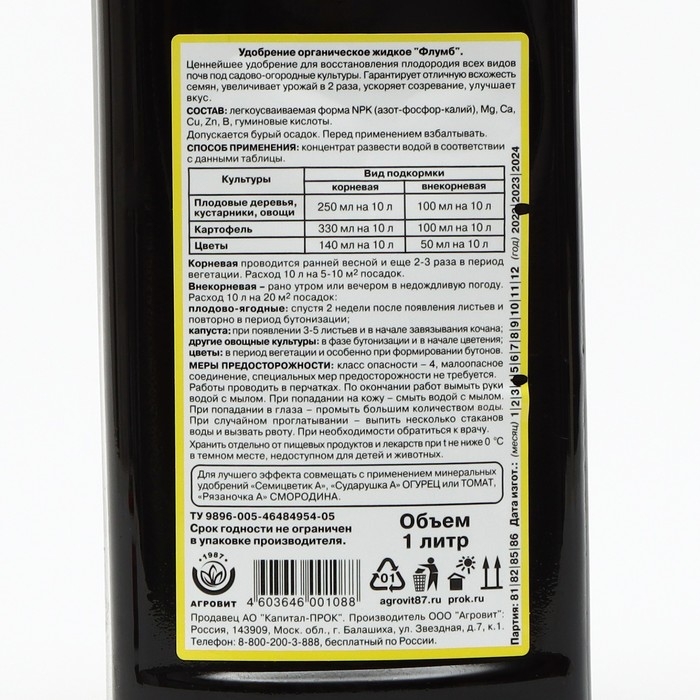 Ценнейшее органическое удобрение Флумб для восстановления плодородия всех видов почв, содержит оптимальный набор питательных веществ. Продукт получен методом экстракции навоза на специальном оборудовании по технологии, обеспечивающей его полную очистку от яиц гельминтов, семян сорных растений и патогенной микрофлоры. Флумб препятствует аккумуляции в растениях тяжелых металлов, мышьяка, радионуклидов и нитратов из почвы.