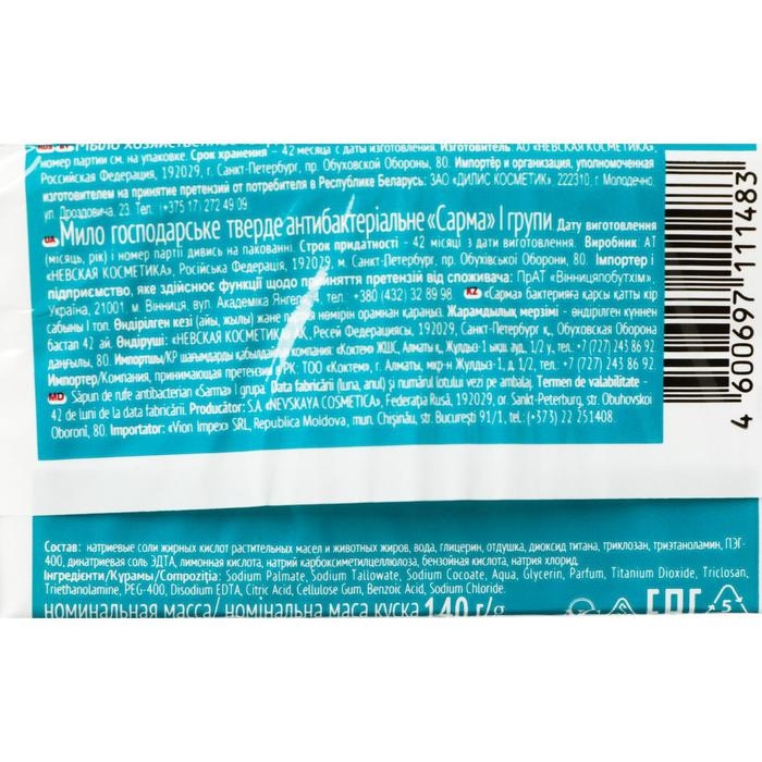 Мыло хозяйственное Sarma 3 в 1 «Антибактериальное», 140 г