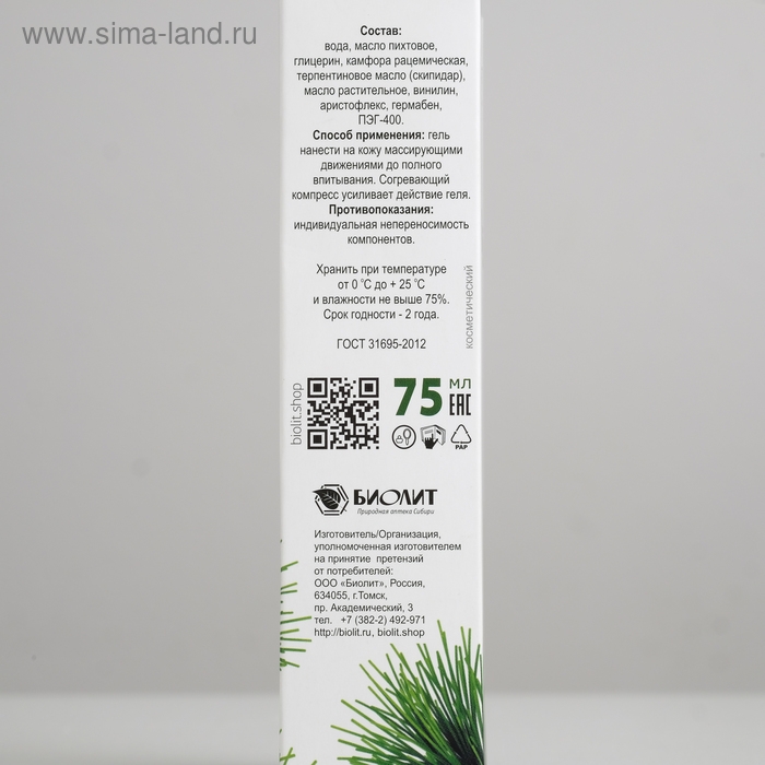Гель Пихтовый, от простуды и бронхита, для суставов, в индивидуальной упаковке, 75 мл