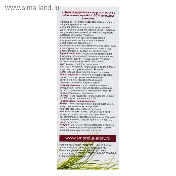 «Живица кедровая на кедровом масле с добавлением мумиё» — 100%-ый природный комплекс. Природный комплекс кедрового масла, живицы кедра и мумиё помогает: при неблагоприятных изменениях опорно-двигательного аппарата (боли в спине и суставах, нарушение двигательной активности, переломы, растяжения, ушибы, гематомы); нарушениях органов пищеварения (гастриты, язва, дисбактериоз, пищевые и лекарственные отравления); неблагоприятных изменениях на коже (сыпь, акне, фурункулы, покраснение, псориаз и т. д.); облысении, выпадении волос, перхоти.