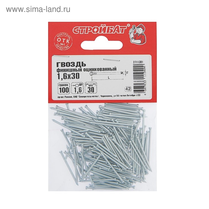 Гвозди СТРОЙБАТ, финишные, ГОСТ 7811-7035, оцинкованные, 1,6x30 мм, 0,1 кг