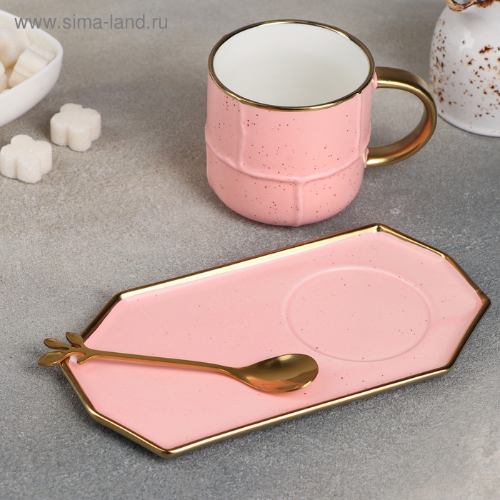 Чайная пара керамическая с ложкой «Весна», 2 предмета: кружка 300 мл, блюдце, цвет розовый
