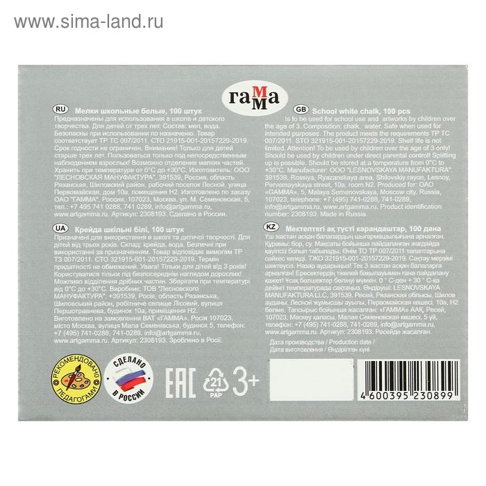 Мелки для рисования "Гамма", белые, 100 штук, мягкие, квадратная форма, картонная коробка