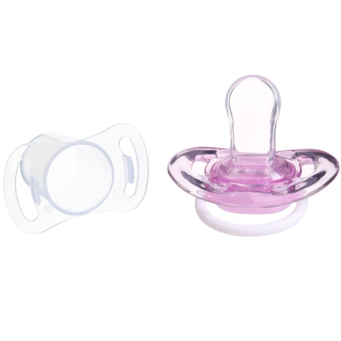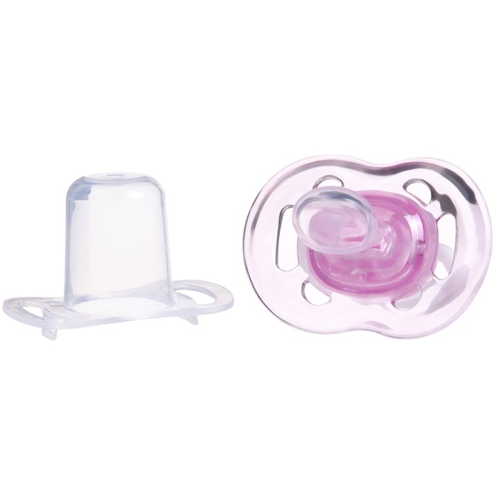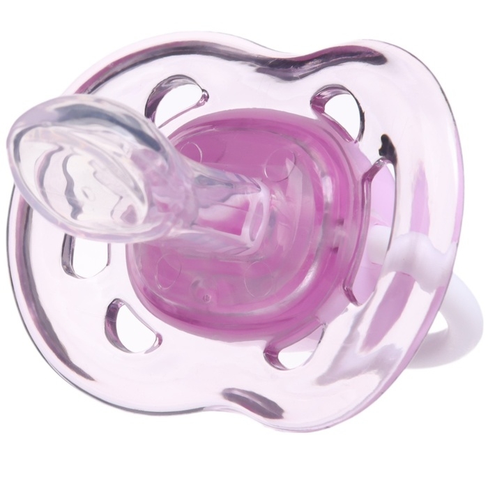 Соска пустышки силиконовая и имеет анатомическую форму диска, специальные вентиляционные отверстия на пустышке улучшают циркуляцию воздуха не раздражают кожу малыша и не оставляют следов и опрелостей. Создана для удовлетворения естественного сосательного рефлекса малышей. Пустышка анатомической формы имеет немного сплюснутый сосок, благодаря чему прилегает к языку.