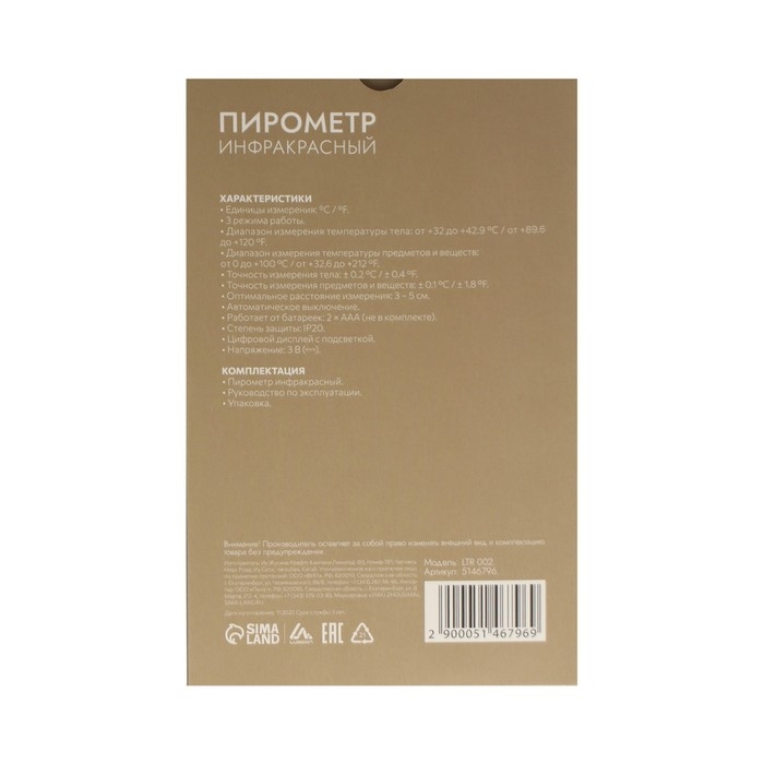 Пирометр бесконтактный Luazon LTR 002, инфракрасный, ЖК-дисплей, 2хААА(не в комп), подсветка