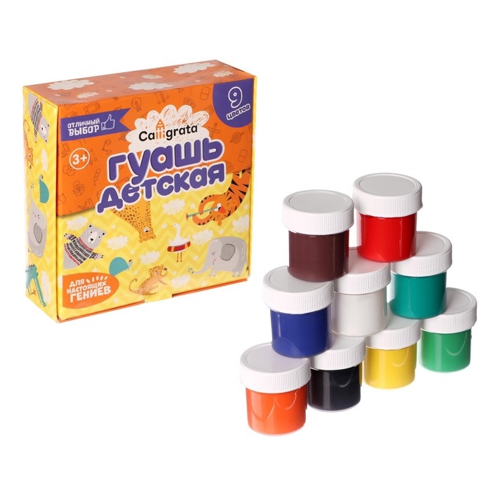 Гуашь для рисования Calligrata серии ""Отличный выбор"" предназначена для творческих занятий в школе и дома. Краска производится на основе качественного прозрачного связующего вещества, обеспечивающего чистоту цвета. Плотная, укрывистая текстура красок хорошо смешивается, равномерно наносится практически на любую основу. При высыхании дает бархатистый матовый эффект. Безопасны для детей, нетоксичны. В наборе 9 баночек разных цветов. Объём каждой баночки - 20 мл. Цветовая палитра гуаши Calligrata состоит из классических оттенков.