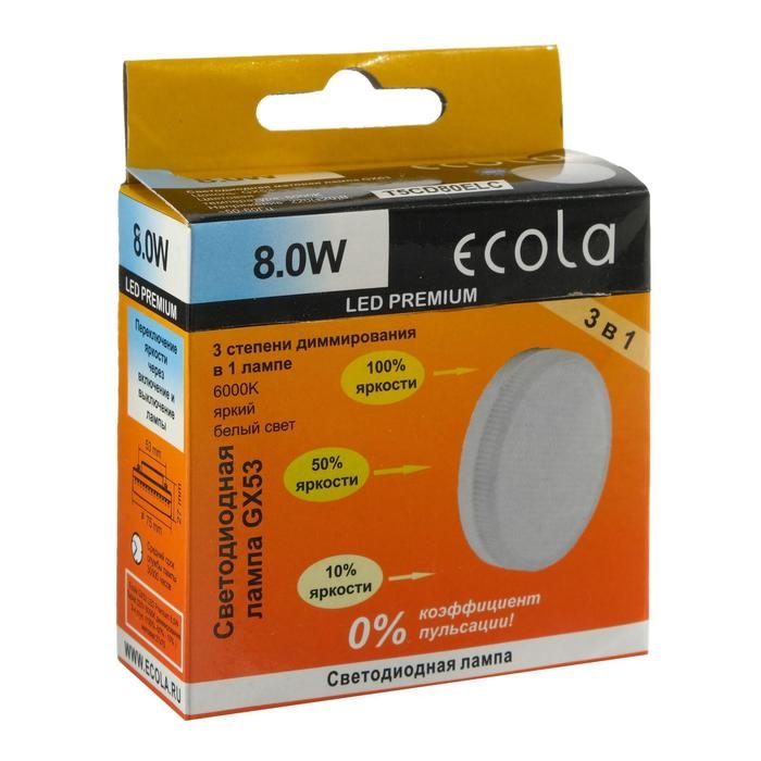 Лампа светодиодная Ecola Premium, GX53, 8 Вт, 6000 К, 220 В, 27х75мм, диммирование 3 ступени