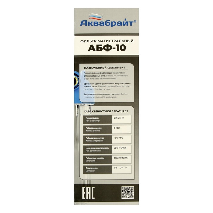 Корпус для фильтра "Аквабрайт" АБФ-10-34, 3/4", для холодной воды, ключ и крепеж, прозрачный