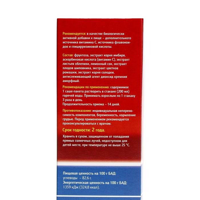 Состав: фруктоза, экстракт корня имбиря, аскорбиновая кислота (витамин С), экстракт листьев облепихи, лимонный сок (порошкообразный), экстракт плодов шиповника, экстракт цветков ромашки, экстракт корня солодки, антислеживающий агент диоксид кремния аморфный (Е551).