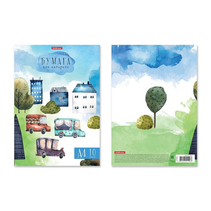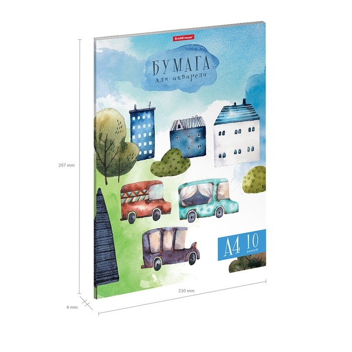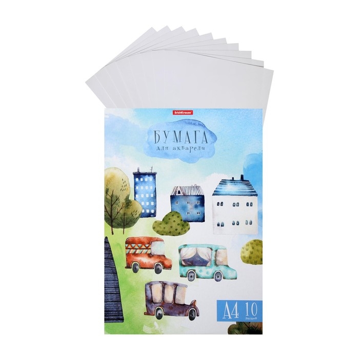 Бумага для акварели А4, 10 листов, блок 180 г/м², ErichKrause "Черничный бульвар", 100% белизна, в картонной папке
