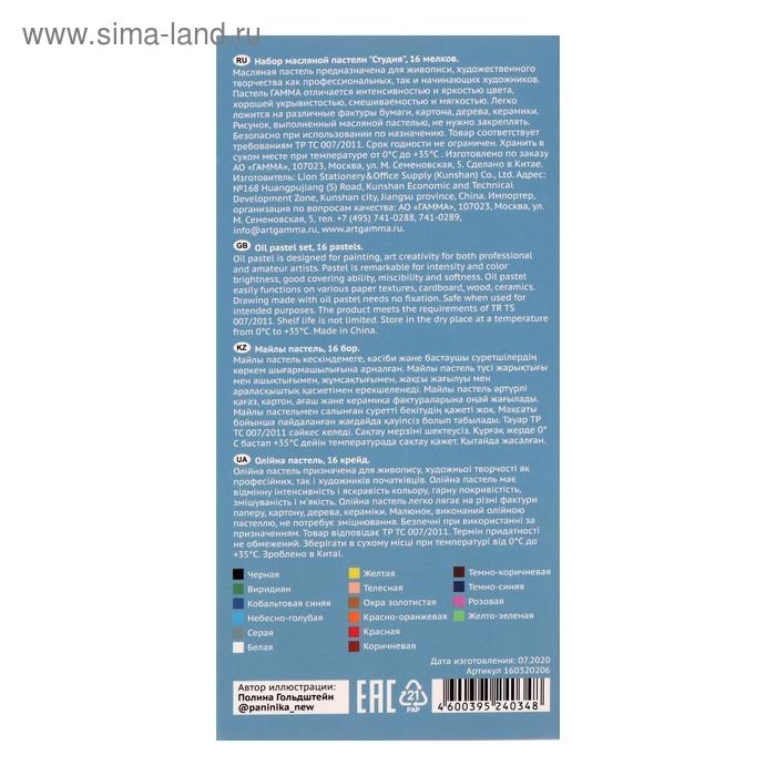 Пастель масляная, набор 16 цветов, Гамма "Студия", d-8мм, l-65мм, в картонной коробке