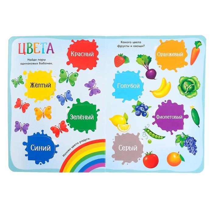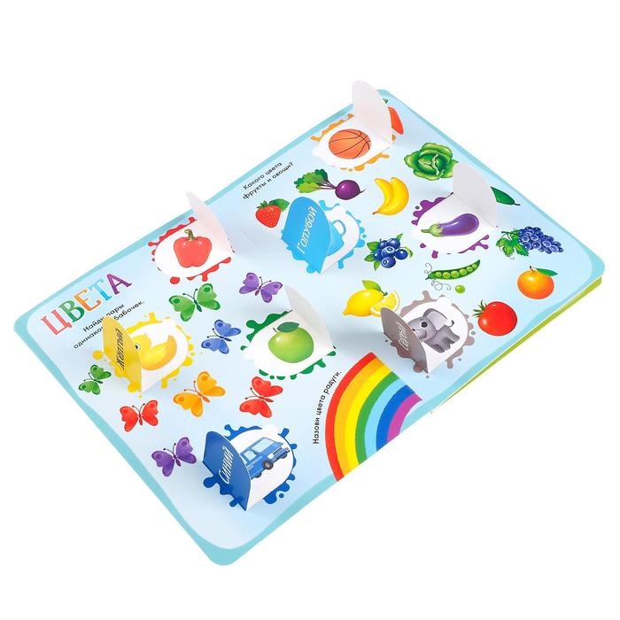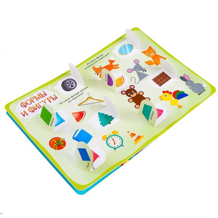 Книга сделана из плотного картона, поэтому прослужит долго. Внутри ребёнок найдёт 32 окошка с яркими изображениями животных, фруктов, овощей и других предметов. Также в книжке есть интересные задания, типа «Найди и покажи».