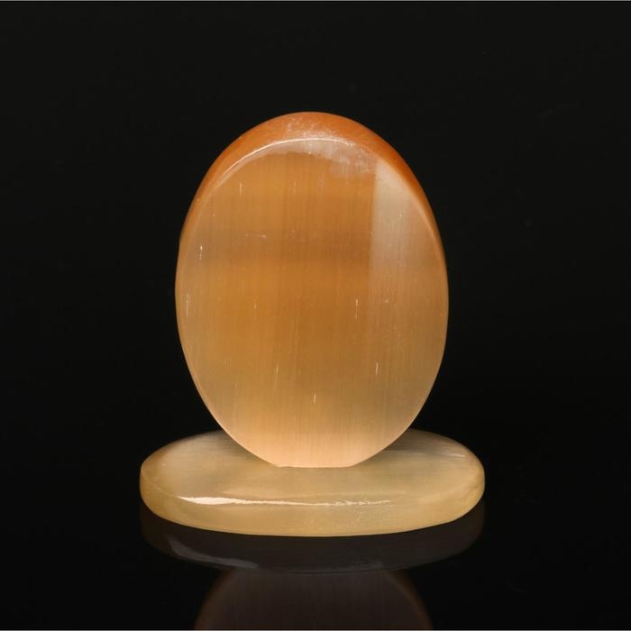 Селенит — это материал, который относится к разновидности гипса, жёлто-розового цвета с шелковистым блеском. Внутренние волокна расположены плотно, это даёт эффект «кошачьего глаза». Изделия из селенита завораживают игрой света, нежными тонами и хрупкостью. При прикосновении есть ощущение исходящей энергии.