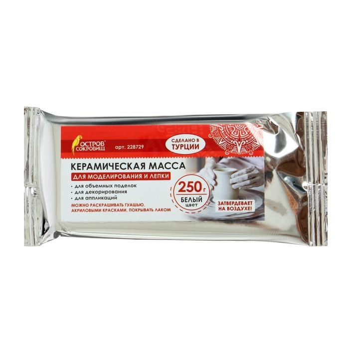 Керамическая масса Остров Сокровищ предназначена для моделирования, лепки, декорирования и создания объемных аппликаций. Самостоятельно затвердевает на воздухе, не требуя термической обработки. Масса для моделирования и лепки изготовлена из натуральной глины без добавления дополнительных примесей. Очень мягкая и пластичная, не липнет к рукам. Удобная в работе - легко лепится, раскатывается, режется, принимает любую форму.Перед началом работы необходимо смочить руки в теплой воде и размять массу мокрыми руками. В процессе лепки для размягчения массы можно использовать воду.Готовое изделие затвердевает на воздухе в течение 12 часов. После высыхания изделие становится очень прочным, не трескается, не усаживается. Затвердевшие и высохшие предметы можно раскрашивать гуашью или акриловыми красками, покрывать лаком. Перед началом работы необходимо смочить руки в теплой воде и размять массу мокрыми руками. В процессе лепки для размягчения массы можно использовать воду.Хранить массу необходимо в герметичной емкости, вдали от тепла и попадания солнечных лучей.