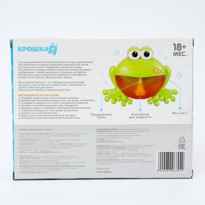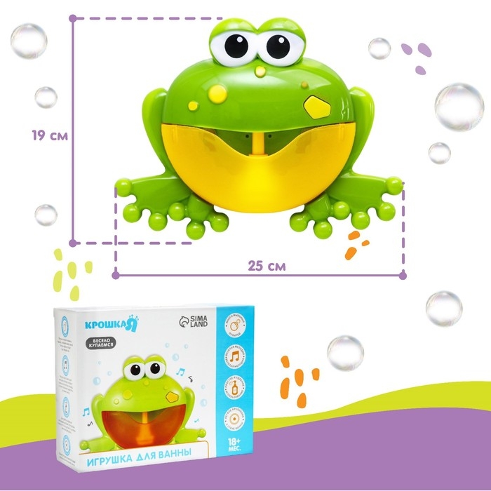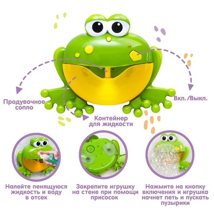 С музыкальной веселой лягушкой купаться одно удовольствие! При наполнении игрушки ароматным шампунем или пеной для ванны она начнет генерировать мыльные пузыри под приятные мелодии. Игрушка помогает малышу развивать воображение, а также визуальное и слуховое восприятие. Контрастные цвета привлекают внимание и благоприятно влияют на способность фокусировать зрение. Музыкальная лягушка – это забавные мыльные пузыри для детей, а для остальных членов семьи – возможность сделать себе пену для ванны! Игрушка изготовлена из прочного пластика.