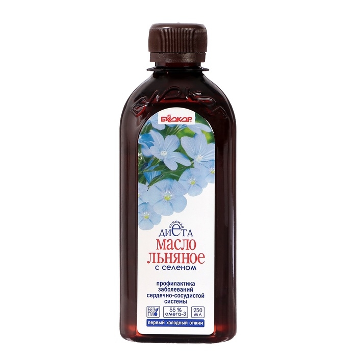 Масло льняное с селеном «Биокор» — натуральный высокоэффективный продукт, источник незаменимых полиненасыщенных жирных кислот (ПНЖК): Омега-3 (55 %) и Омега-6 (10-20%), для поддержания здоровья и сохранения красоты.