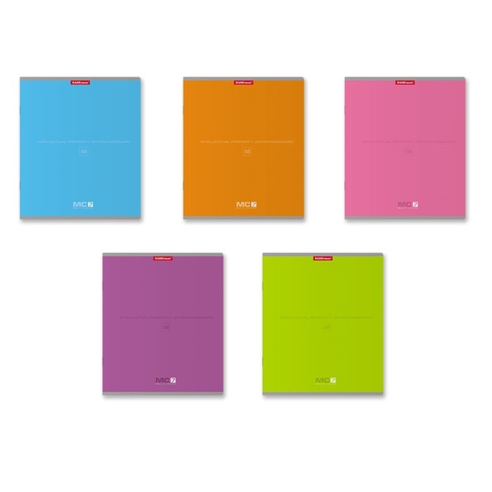 Тетрадь общая формата А5+ (170х203 мм). Обложка из высококачественного мелованного картона плотностью 190 г/м2. В блоке 48 листов в клетку с полями. Бумага офсетная плотностью 60 г/м2. Цвет линовки - синий. Скругленные уголки обложки и блока. Тип скрепления - скоба. Тетради разных цветов упакованы в термоусадочную пленку по 5 штук.