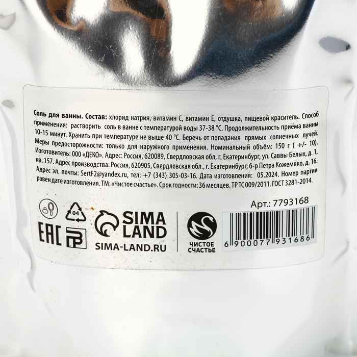 Состав: соль морская природная, витамин Е, витамин А, витамин С, отдушка, пищевой краситель.