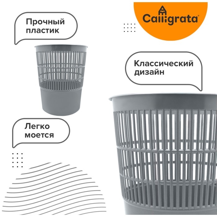 Корзина для бумаг и мусора 14 литров, Сalligrata "Доступный офис", пластик, сетчатая, серая