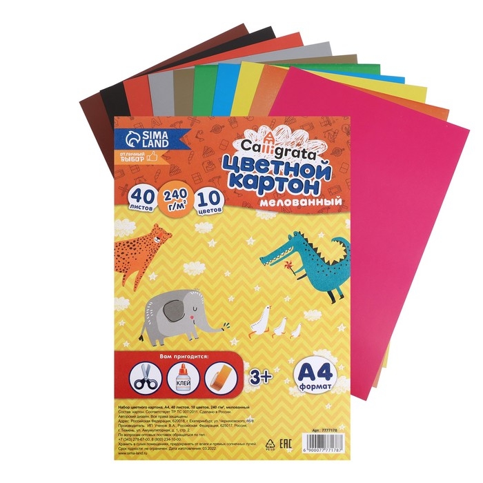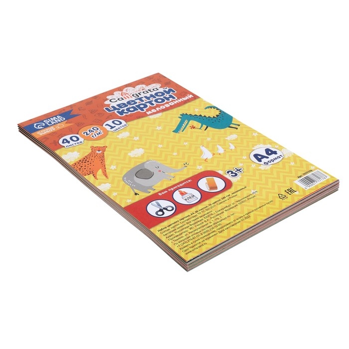 Картон цветной А4, 40 листов, 10 цветов, Calligrata, мелованный 240 г/м2
