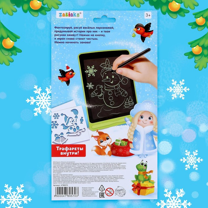 Детский LED-планшет для рисования оживит любые фантазии. В распоряжении малыша есть экран и волшебная ручка, а значит, он может отправиться в новогоднее путешествие вместе с Дедом Морозом, Снегурочкой, Снеговичком, нарядить ёлочку и повстречать добрых весёлых зверят.