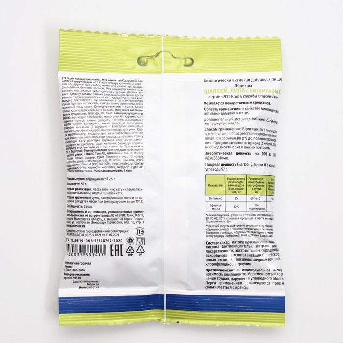 Леденцы "911" шалфей, липа, витамин С, 50 г
