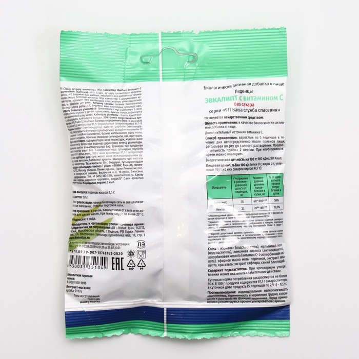 Леденцы "911" эвкалипт, витамин С, масло мяты, 50 г