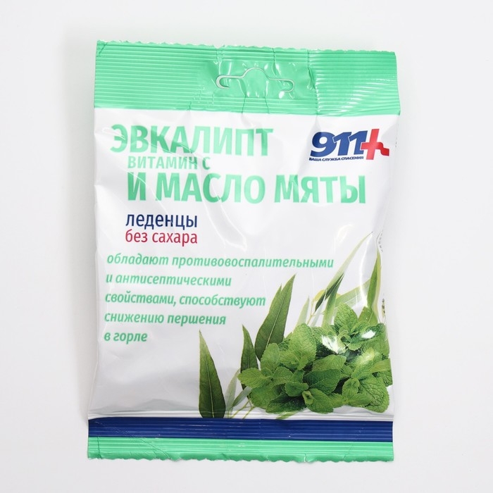 Леденцы "911" без сахара, эвкалипт, витамин С, масло мяты обладают противовоспалительными и антисептическими свойствами, способствуютснижению першения в горле.