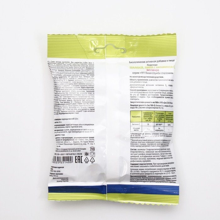 Леденцы "911" без сахара, шалфей, липа, витамин С, 50 г