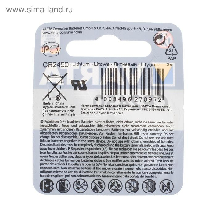 Батарейка литиевая Varta, CR2450-1BL, 3В, блистер, 1 шт.