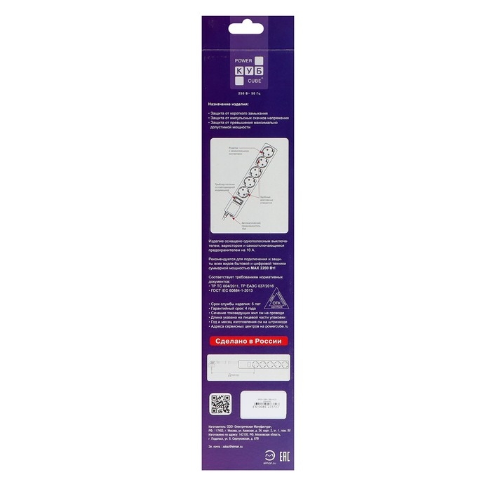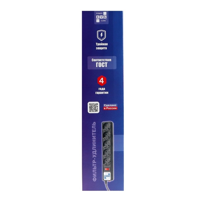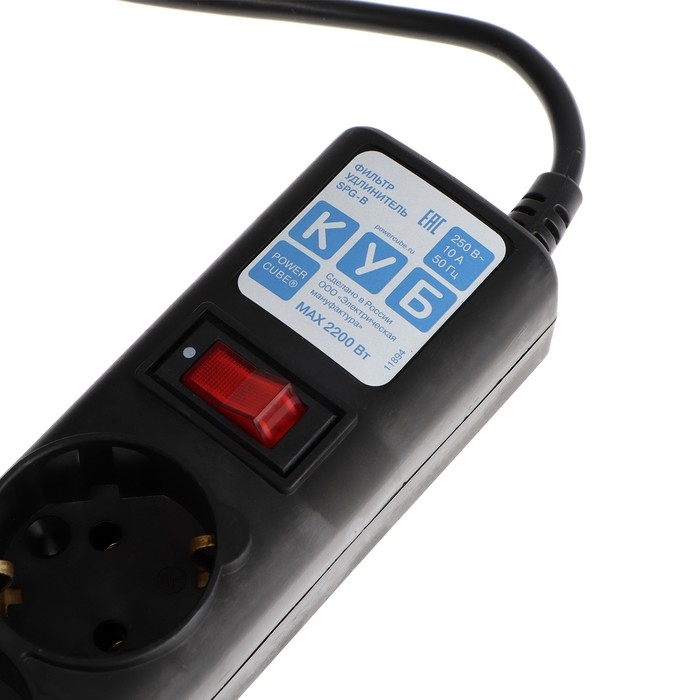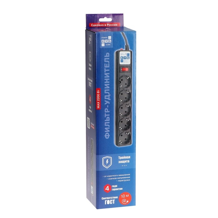 Сетевой фильтр "КУБ", 5 розеток, 10 м, 10 А, 2200 Вт, с з/к, SPG5-10M, черный