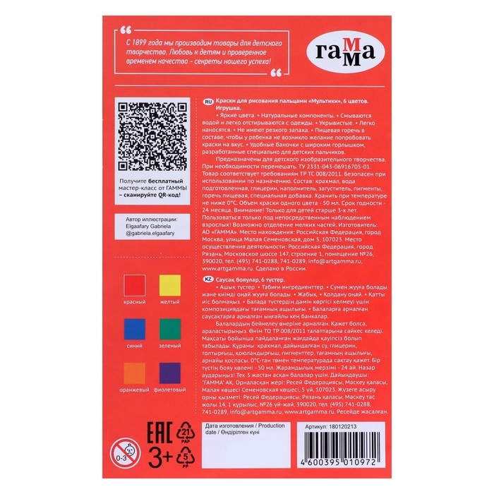 Краски пальчиковые 6 цветов по 50 мл Гамма "Мультики", классические, картонная упаковка