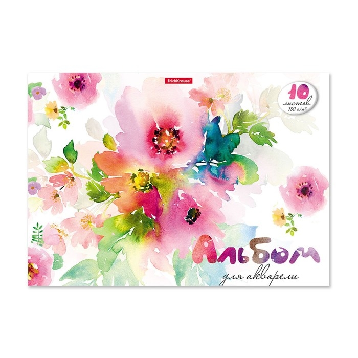 Альбом для акварели А4, 10 листов, блок 180 г/м², на клею, Erich Krause "Цветочная акварель", экстра белая, твердая подложка