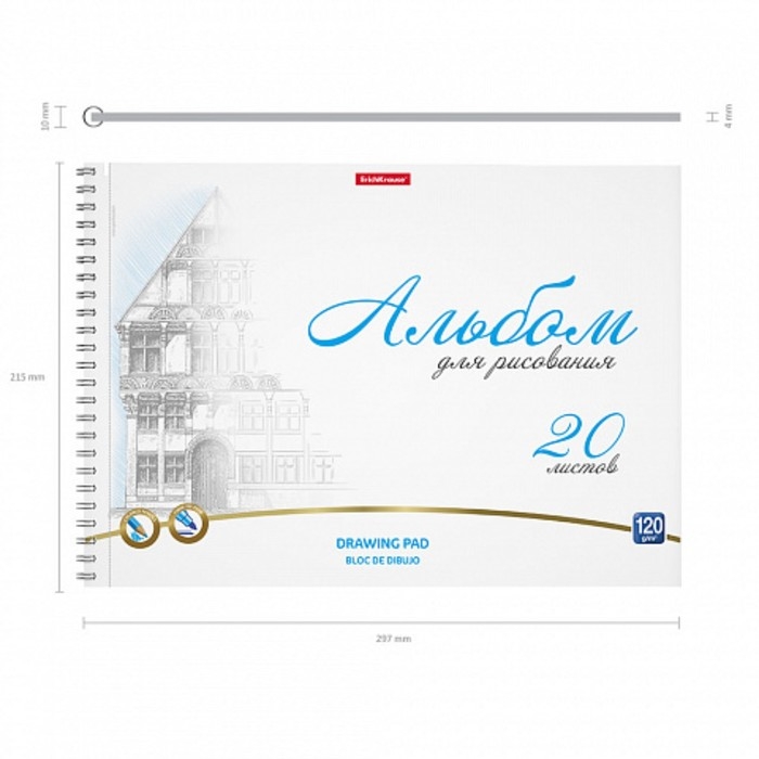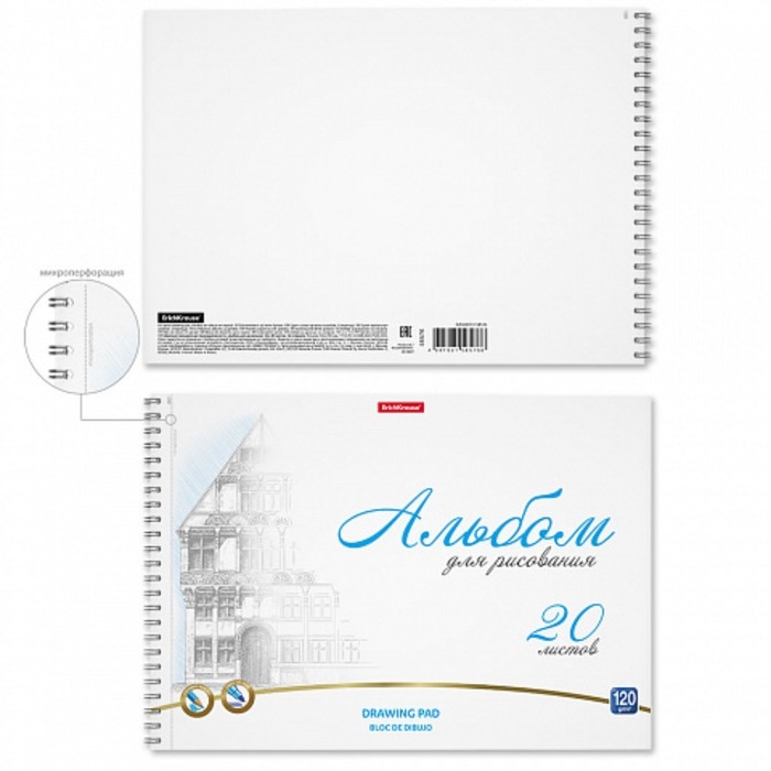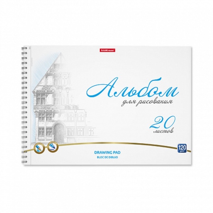 Альбом для рисования формата А4 (210х294 мм). Обложка из высококачественного мелованного картона плотностью 170 г/м2. Жесткая подложка 360 г/м2. В блоке 20 листов. Бумага плотностью 120 г/м2. Белизна бумаги - 100%. Микроперфорация для отрыва. Тип скрепления - спираль. Альбомы упакованы в термоусадочную пленку по 10 штук.
