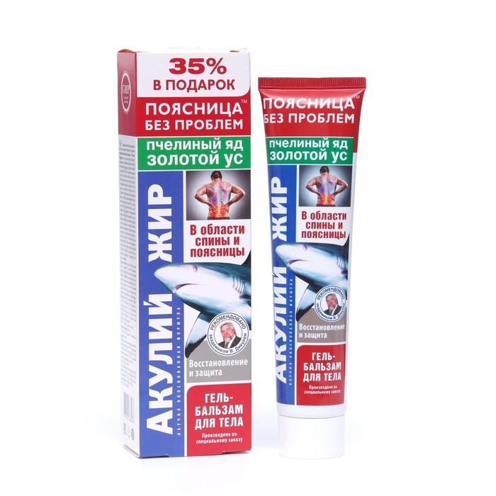 Гель-бальзам для тела "Акулий жир" с пчелиным ядом и с золотым усом способствует снятию признаков воспаления, выведения накопленных токсинов, поэтому могут использоваться для лечения артритов, снятия мышечных, суставных болей, после радиоактивного воздействия для предотвращения развития осложнений.