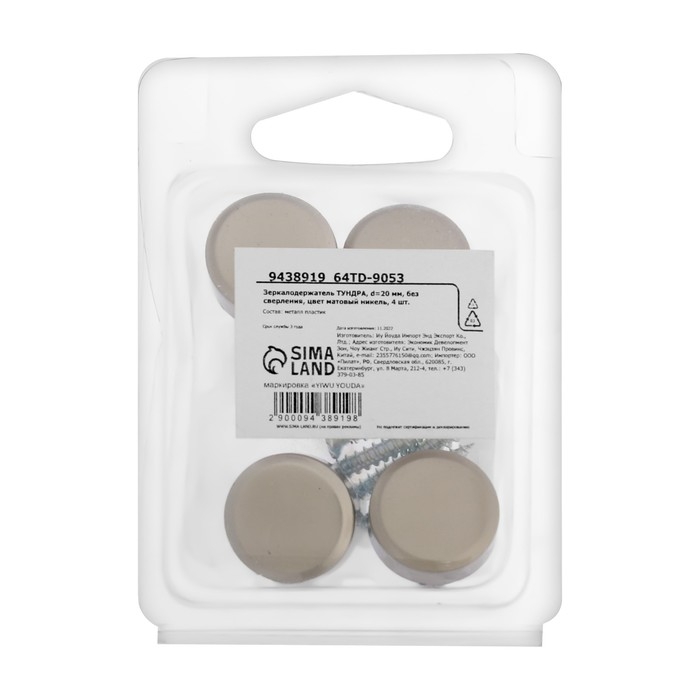 Зеркалодержатель ТУНДРА , d=20 мм, без сверления, цвет матовый никель, 4 шт.