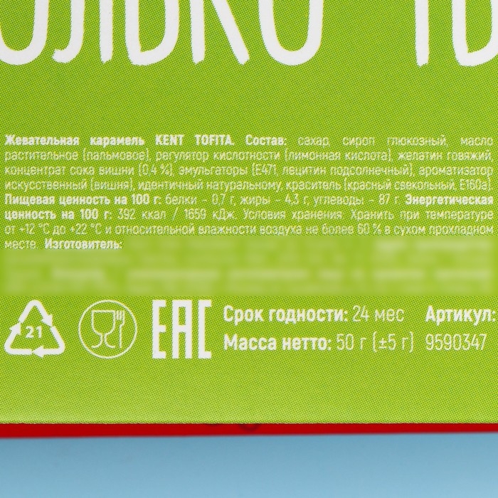 Состав: сахар, сироп глюкозный, масло растительное (пальмовое), регулятор кислотности (лимонная кислота), желатин говяжий, концентрат сока вишни (0,4 %),эмульгаторы (Е471, лецитин подсолнечный), ароматизатор искусственный (вишня), идентичный натуральному, краситель (красный свекольный, Е160а).