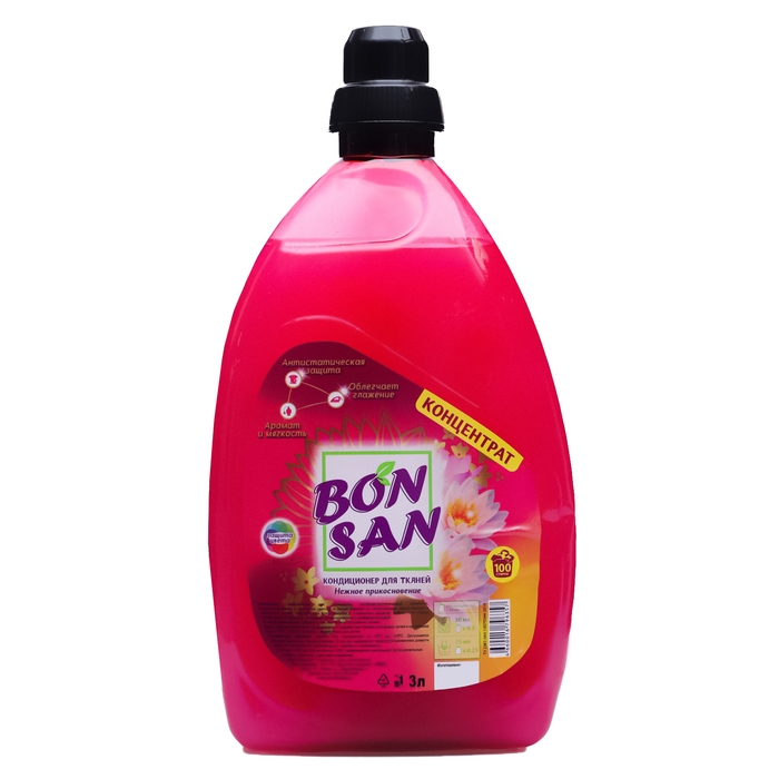 Кондиционер-концентрат для тканей Bonsan Нежное прикосновение 3 л. Подходит для использования в стиральных машинах любого типа. Перед применением встряхнуть. Не требует предварительного разбавления водой. Способ применения: применять при последнем полоскании тканей.