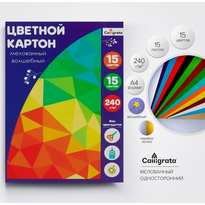 Картон цветной А4, 15 листов, 15 цветов, в папке "Радужный", золото+серебро, мелованный 240 г/м2