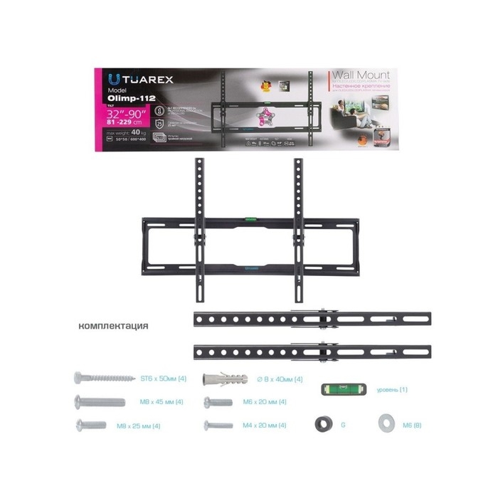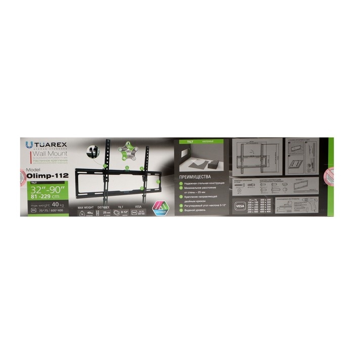 TUAREX OLIMP-112 BLACK надёжно удержит экран размером 32"-90" дюйма и весом 40 кг. Простая конструкция TUAREX OLIMP-112 BLACK идеально подойдет для самостоятельного монтажа. Наклонная конструкция регулировать экран вверх и вниз на 0 -12°.