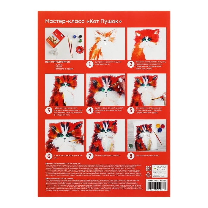 Бумага благодаря тому, что изготовлена из 100% целлюлозы полностью безопасна для детей. Для первых шагов в искусстве малышу в подарок на обратной стороне папки мастер-класс по рисованию.