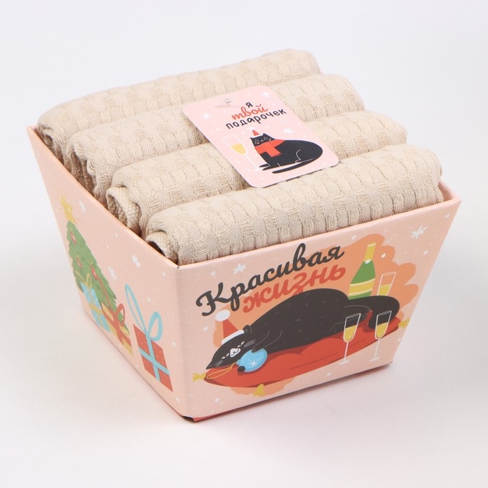 Новогодний подарок. Набор кухонных полотенец Доляна, цвет бежевый, 35х60 см - 4шт, 100% хл, вафля 220 г/м2