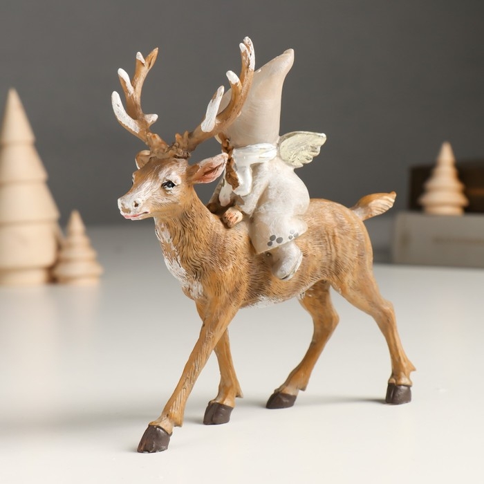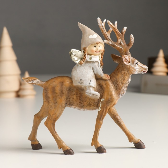 Сувенир полистоун "Малышка-ангел в сером наряде, верхом на олене" 5,5х14х14,5 см